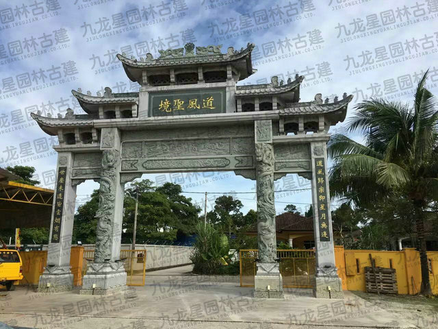 牌坊集中了中國古建筑最有特征的構件組成,有臺座、柱身(包括夾桿石)、梁坊、樓匾、斗拱、樓頂等構件。石造牌坊材質堅固敦實牢靠,且可仿照木結構造型。在藝術處理上,可以在夾桿石、柱子、額坊等處,雕刻各式各樣的花鳥、圖案、龍鳳及各種瑞獸等等,將中國傳統的石刻藝術集中于一身表現出來。中國民俗專家講:“石雕不開光是石雕工藝品,開光后就是具有靈氣的風水神器。”所以“非寧靜無以致遠,非精誠無以神明。” 石牌坊是用石修建的牌坊,是一種裝飾建筑物。柱石的上方刻有麒麟、獅子,夾柱石的浮雕有雙獅戲彩珠,牌坊上還雕刻著其他怪獸云紋。兩側基石柱各有撐鼓,石柱兩側配有石獅。牌坊運用浮雕、透雕等手法,是我國建筑藝術的一大特色。