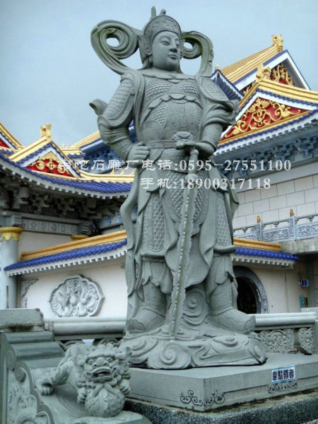 韋馱菩薩像常威武地立于最靠近寺院門口的四天王殿內,面向寺院,以守護道場。其形像大多為身穿甲胄的雄壯武將,手持金剛杵,或以杵柱地,或雙手合十,將杵擱于肘間。韋馱菩薩現天大將軍身擔當佛教中驅除邪魔,保護佛法的重任,為佛教中護法金剛力士的代表之一.
